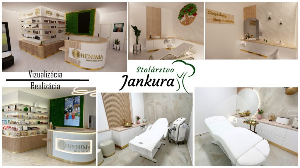 Projekt od návrhu až po realizáciu. Interiér salónu Henima sme zariadili s dôrazom na eleganciu, čisté línie a funkčnosť. Nábytok bol vyrobený na mieru v kombinácii bieleho vysokolesklého laminátu, doplneného o zlaté prvky a teplý dub Nebraska. Pracovná doska v dekore Travertín dotvára jemný, no výrazný detail, ktorý dodáva nádych luxusu a nadčasovosti. V rámci projektu bola zariadená vstupná recepcia, kuchynka a tri samostatné miestnosti, pričom každý priestor je prepojený jednotným štýlom.